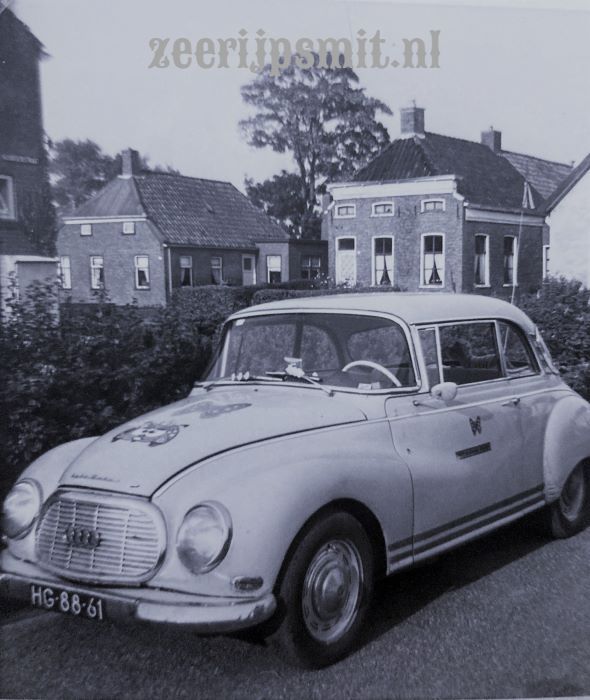 Cees met z'n mooie (DKW) AUDI . De (DKW) AUDI op de Noorderstraat. Cees met de (DKW) AUDI in Spijk.