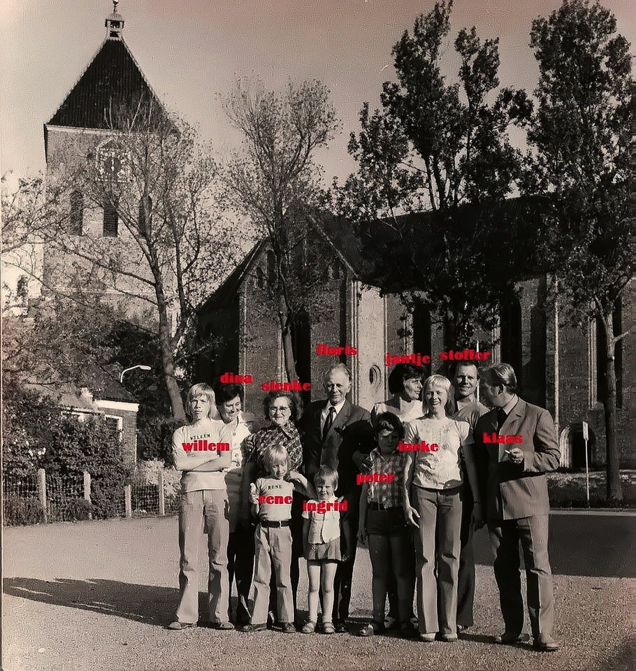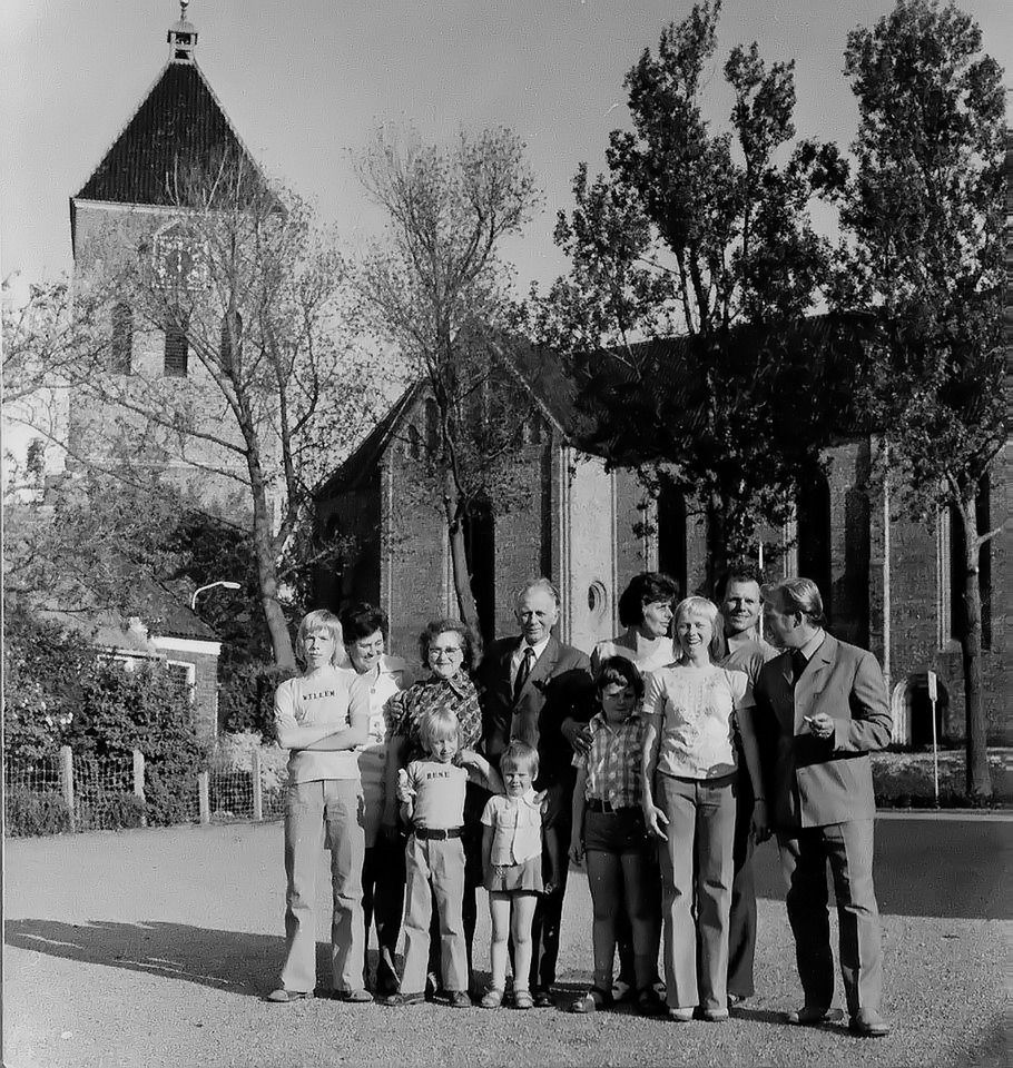 Foto van familie Floris Spijk voor de Hervormde kerk, gemaakt in 1974.