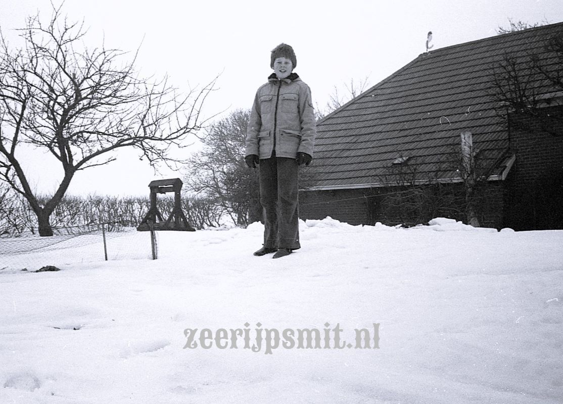 Kleinzoon van familie Floris Spijk, met de naam Peter Vast achter het huis op de sneeuw.
