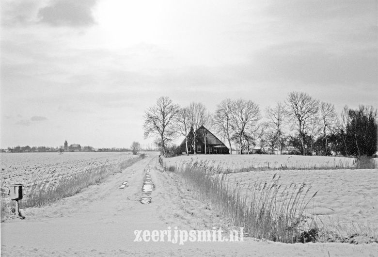 Op de voorgrond is de boerderij van de familie D.K. Bos, op de achtergrond is Zeerijp te zien.