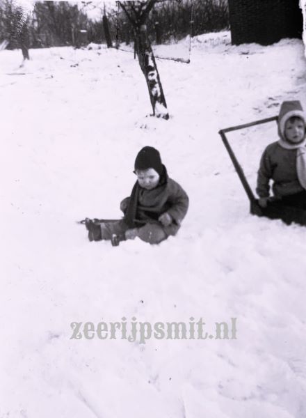 Rolf Wever in de sneeuw. Woning van familie Wever . Jos en oudere broer Rolf op de slee.