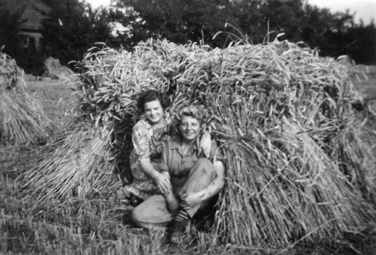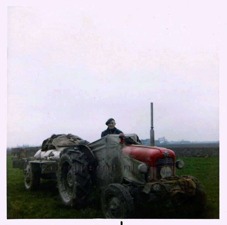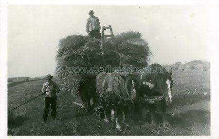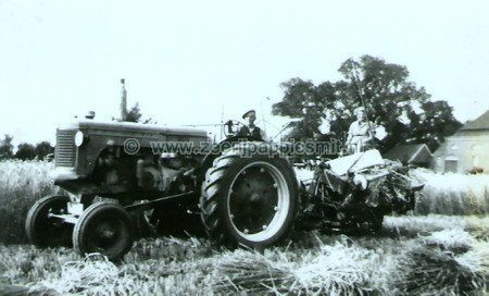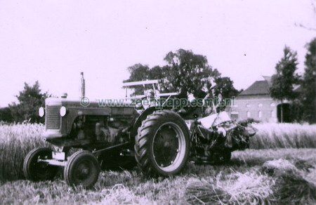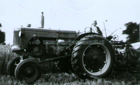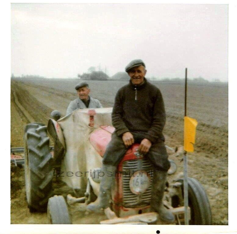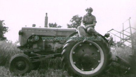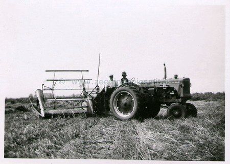 De gebroeders Willemsen aan het werk. Boer Biewenga bestuurd de tractor.